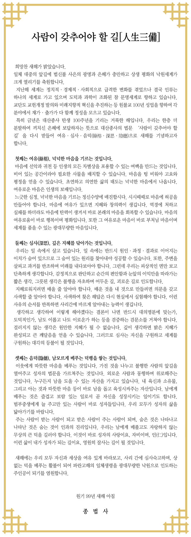 [원기 99년 종법사 신년법문]사람이 갖추어야 할 길