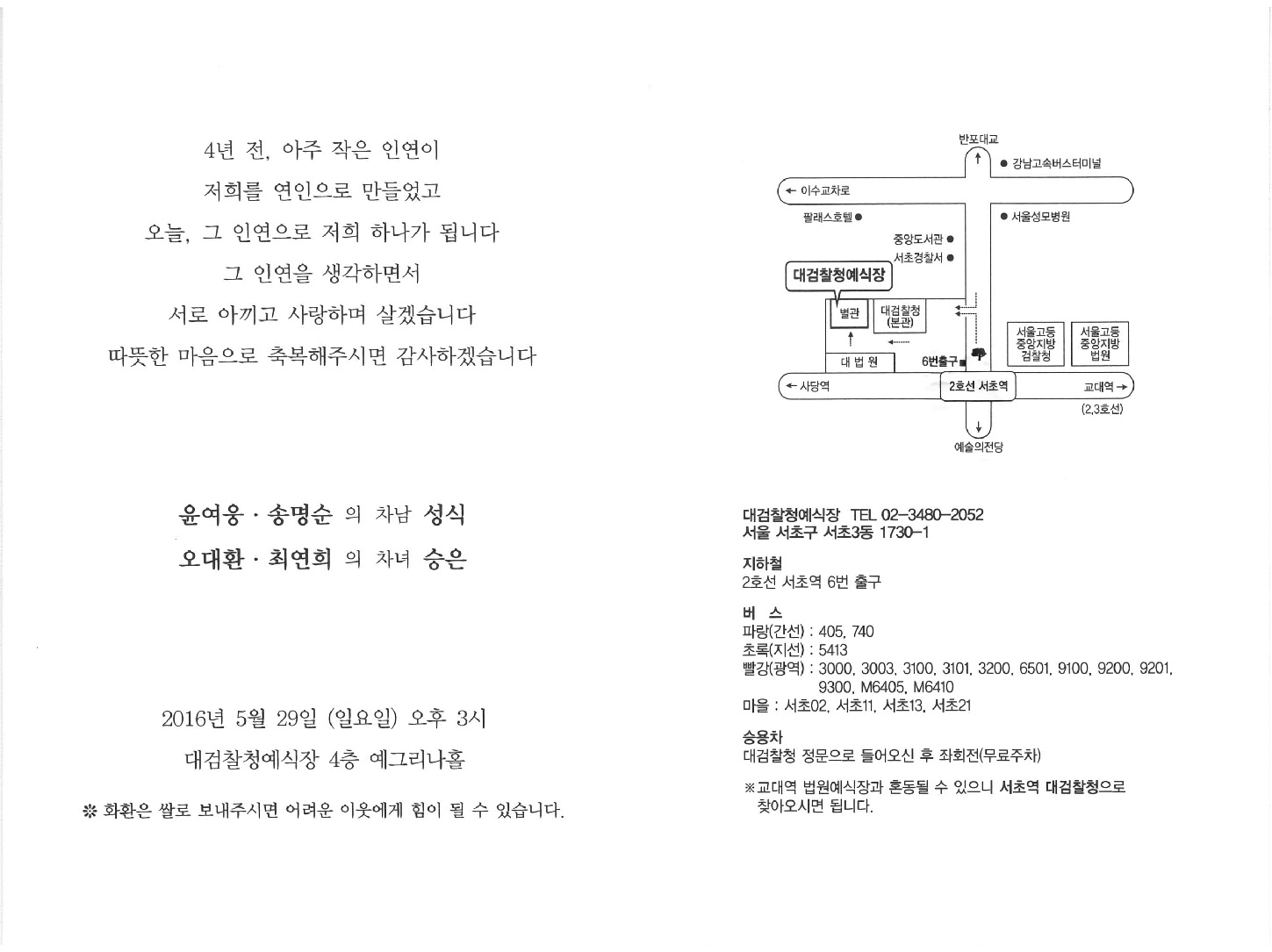 일시 및 장소 : 2016년 5월 29일(일) 오후 3시 대검찰청 예식장 4층 예그리나홀