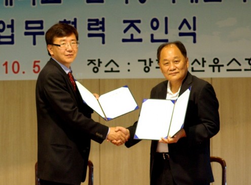 | 지난 5일 강화 남산유스호스텔에서 진행된 '원광디지털대-한국중독재활복지협회 업무협정식'에서 주일경 원광디지털대 대외협력실장(왼쪽)과 신양호 한국중독재활복지협회장이 기념사진을 촬영하고 있다. /사진=원광디지털대학교 |