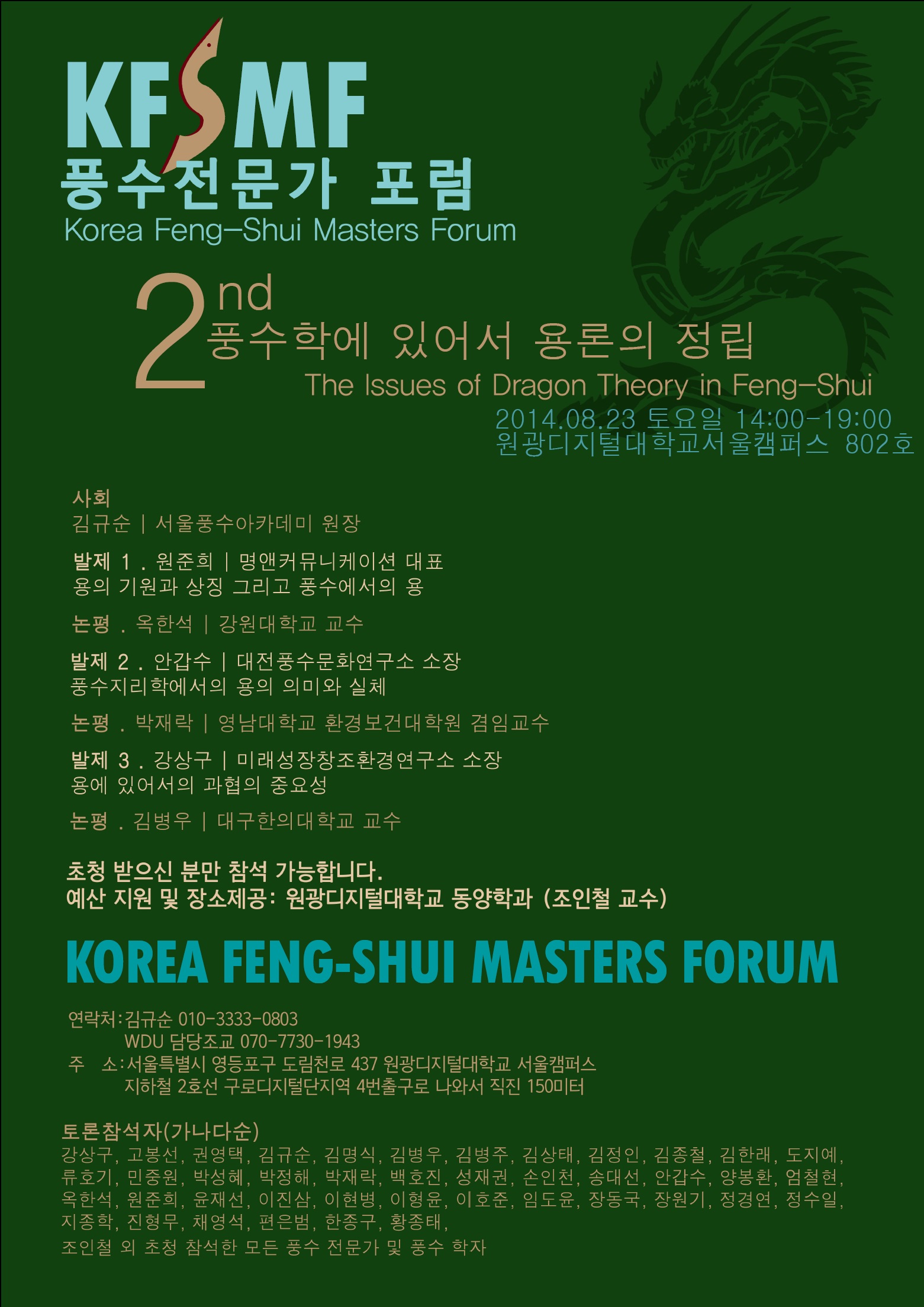 발표는 △용의 기원과 상징 그리고 풍수에서의 용(원준희 명앤커뮤니케이션 대표) △풍수학에서의 용의 의미와 실체(안갑수 대전풍수문화연구소 소장) △용에 있어서의 과협의 중요성(강상구 미래성장창조환경연구소 소장)로 구성될 예정이다.