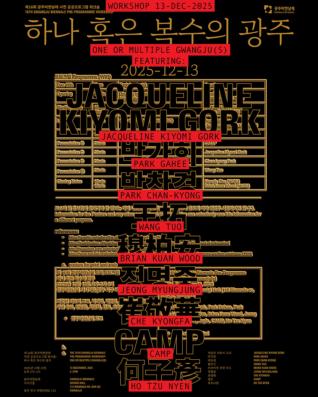 (재)광주비엔날레는 2025년 12월 13일(토) 진행되는 제16회 광주비엔날레 사전 공공프로그램 워크숍을 운영하오니 많은 참여 바랍니다.