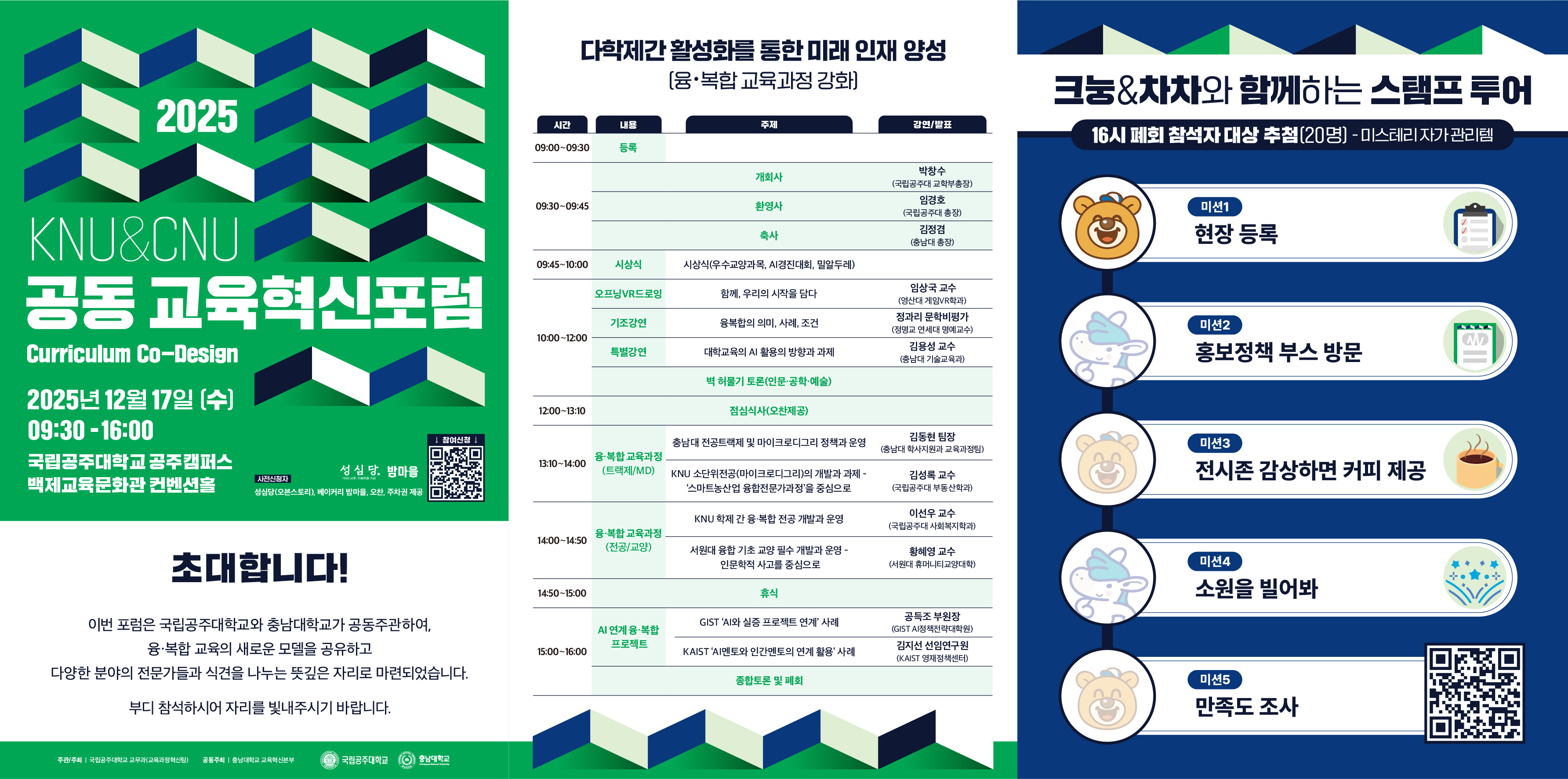 | 제목 | [학생참여] 2025 KNU & CNU 공동 교육혁신 포럼 개최 안내 | ||||