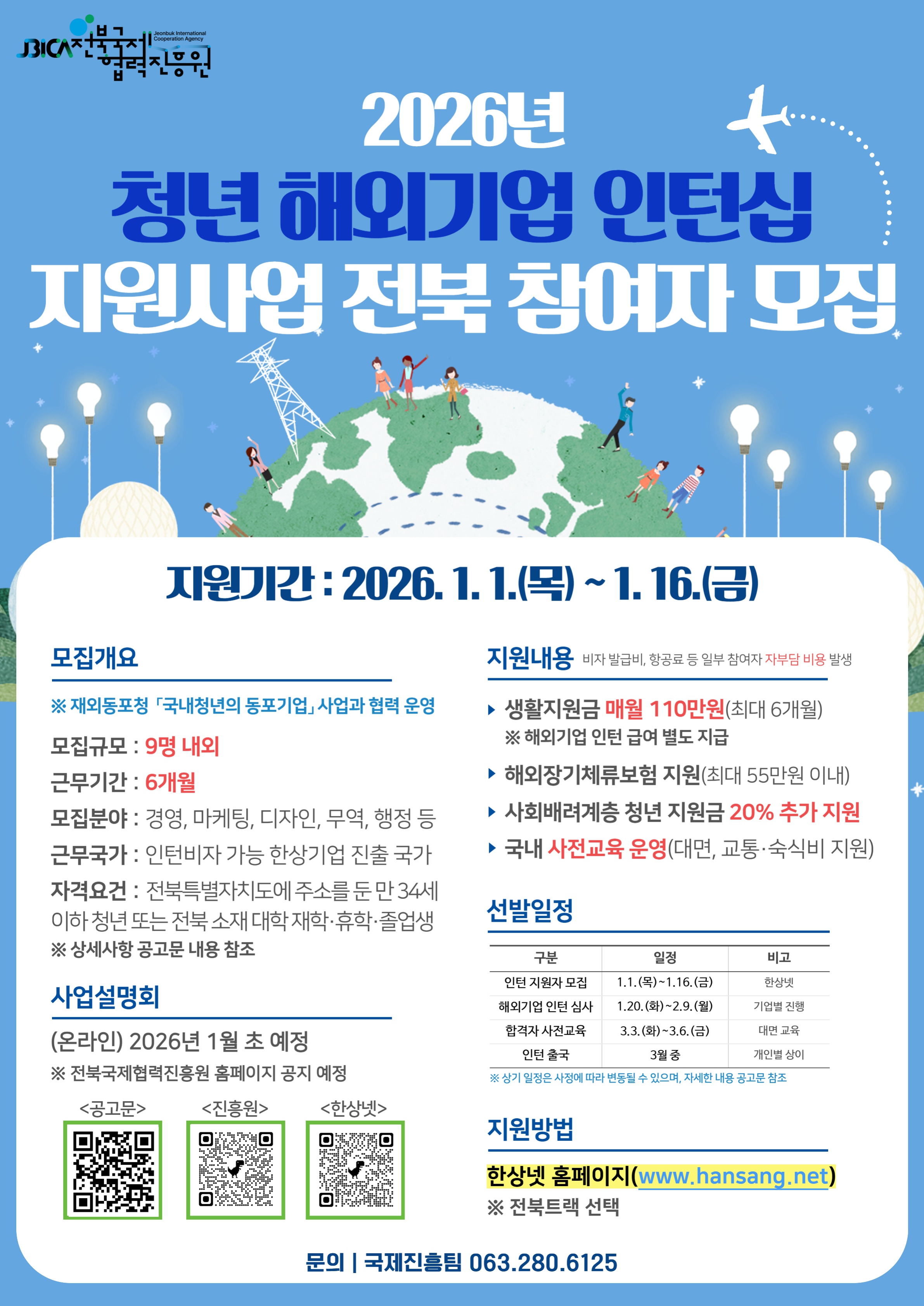 전북국제협력진흥원은 도내 청년들의 해외 진출 지원으로 취업 실무능력 배양 및 글로벌 인재를 양성하기 위해 「청년 해외기업 인턴십 지원사업」을 운영하고 있습니다. 2026년 참여자를 아래와 같이 모집하오니, 많은 관심 바랍니다.