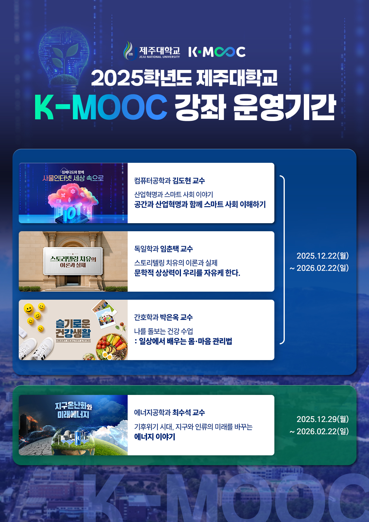 제주대학교에서 2025년도에 신규 개발한 한국형 온라인 공개강좌(K-MOOC)를 아래와 같이 운영하오니, 많은 관심 바랍니다.
