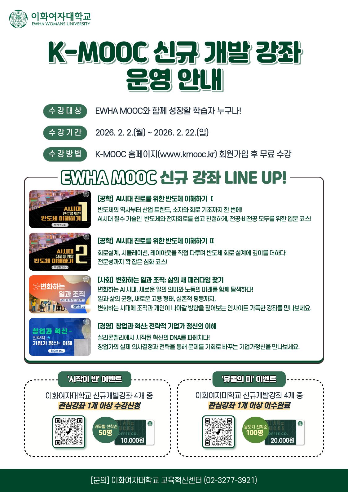 | 제목 | [학생참여] 이화여자대학교 K-MOOC 신규 강좌 수강 안내 | ||||