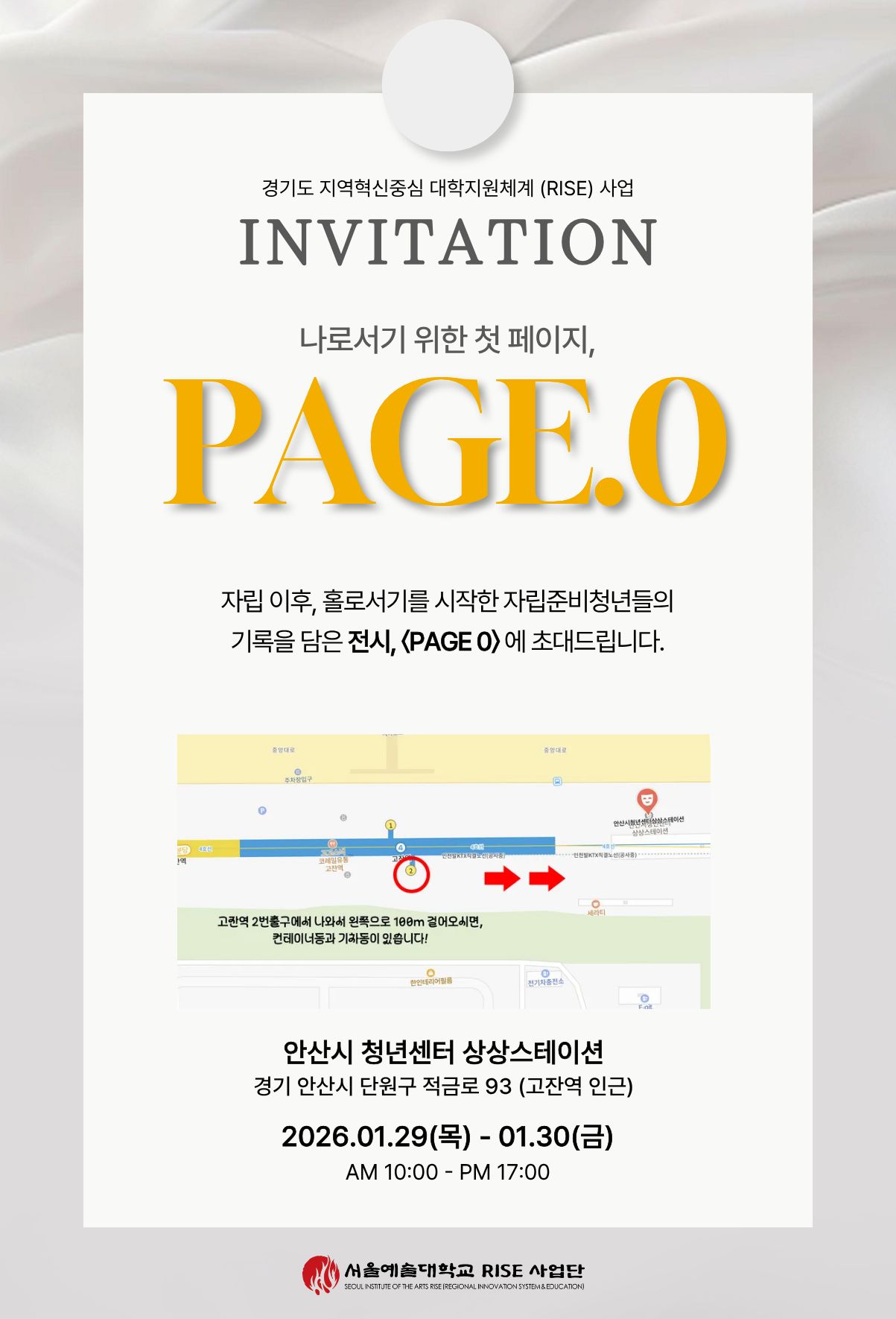 | 제목 | [학생참여] 서울예술대학교 RISE사업단 자립준비청년 기록 전시 「나로서기 위한 첫 페이지, PAGE.0」 개최 안내 | ||||