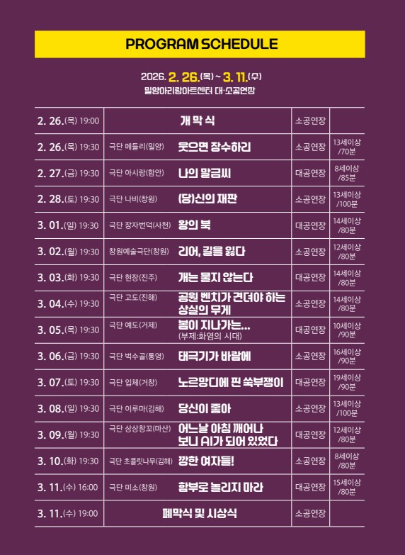 「제44회 경상남도 연극제」가 ‘연극을 잇다 밀양을 잇다’라는 슬로건으로 오는 2. 26.(목)부터 3. 11.(수)까지 14일간 밀양아리랑아트센터에서 개최하오니, 많은 관람 바랍니다.