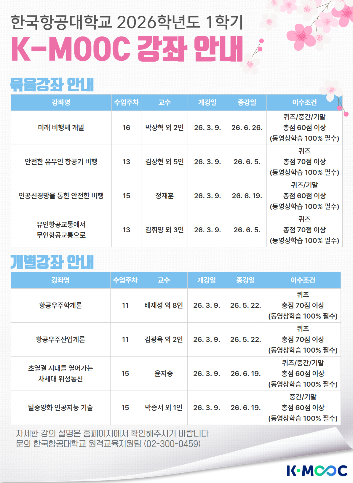 한국항공대학교에서는 2026학년도 1학기 한국형 온라인 공개강좌(K-MOOC)를 다음과 같이 개설하여 운영하오니 많은 관심 바랍니다.